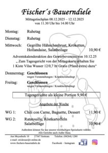 Hallo liebe Besucher unserer Web Seite, hier habt Ihr unsere Aktuellen Essenspläne und Aktuellen Hinweise ( Öffnungszeiten, Aktionen usw. ) Ruf uns gerne jeder Zeit an oder kommt vorbei und sprecht mit uns. Die Mittagstischpläne könnt Ihr hinter dem Button Mittagstischplan finden. Wir freuen uns 🙂 .